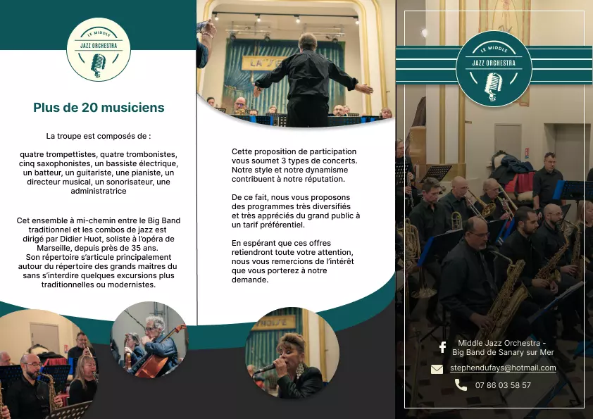 Dans le cadre d'un projet universitaire, j'ai réalisé une révision de la charte graphique d'un orchestre de jazz appelé Middle Jazz Orchestra. J'ai créé une nouvelle affiche pour représenter l'orchestre de manière plus moderne et attrayante, son style encadré, fait référence aux anciens cadres de CD, ce design permet d'interpeller les passants intéressés par la musique. J'ai aussi pu concevoir un flyer aux couleurs de la nouvelle charte graphique, on y retrouve les informations de l'orchestre.