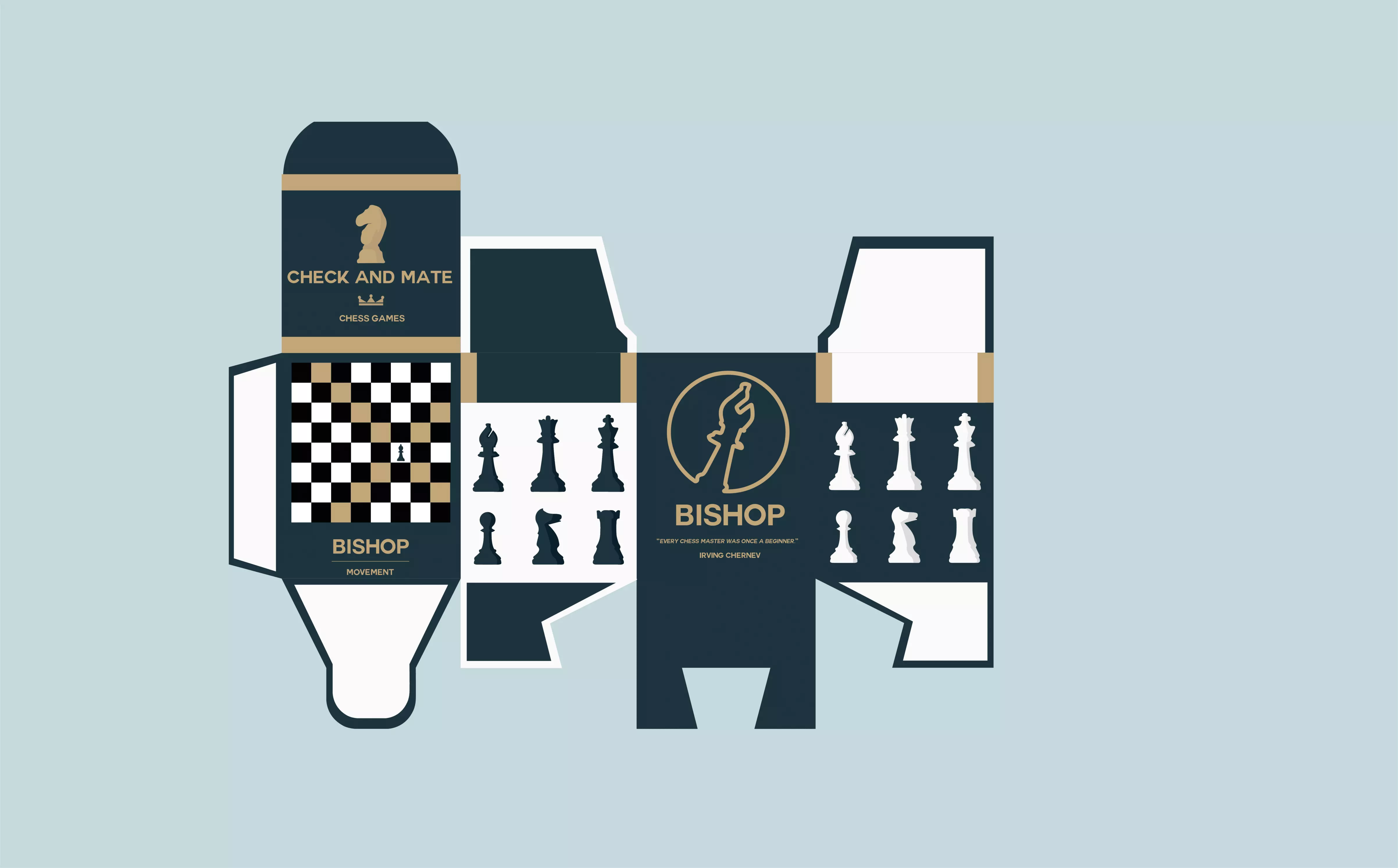 La demande était de créer une marque fictive est de choisir un type de gabarit pour ensuite le personnaliser. Il fallait tout d'abord créer un gabarit du produit (le produit à plat), puis en faire une visualisation en situation, le mockup. j'ai donc choisis d'inventer une marque de vente de pièces d'échecs à collectionner, "Check and mate". Ici nous avons la boîte du "Bishop", le Fou.